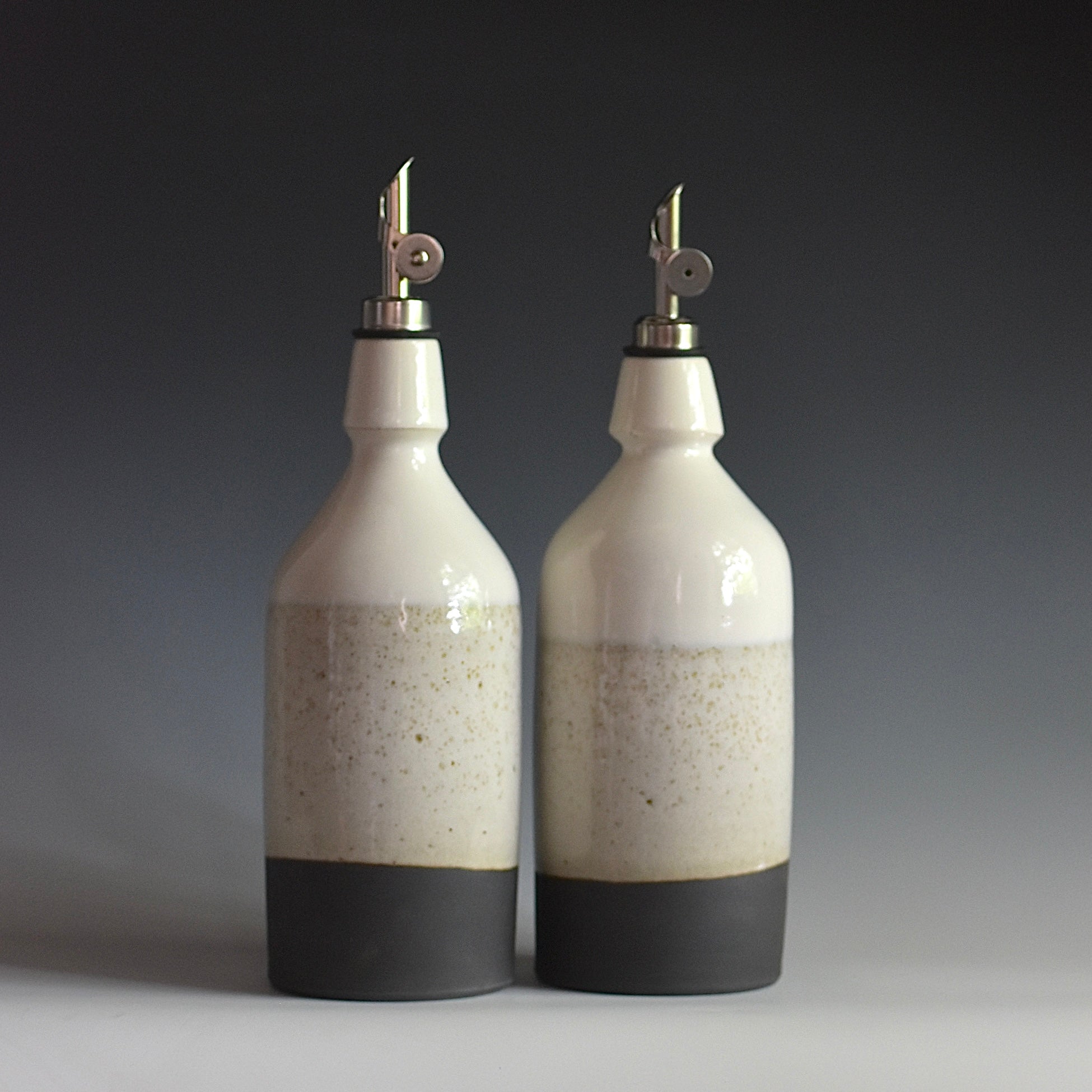 These are made from black stoneware with a clear glaze inside and a high gloss white on the outside. They are kitted out to be used in the kitchen for oil bottles, and the spout can be removed as well if a bottle vase is what is needed.