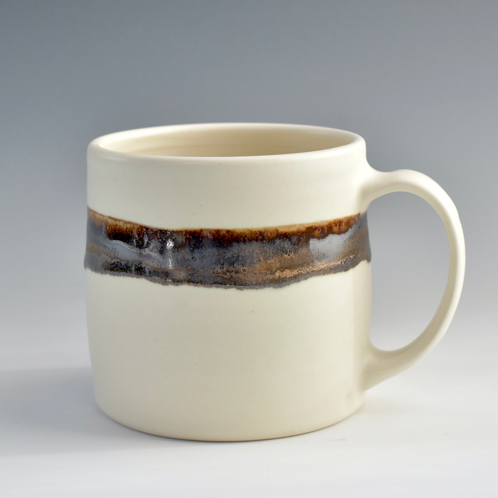 These larger mugs are the softest matte white juxtaposed with a streak of deep bronze metallic chaos. They have a comfortable generous handle. The stripe on each mug varies slightly.